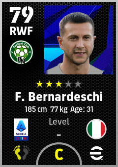 . F. Bernardeschi is a Right Wing Forward footballer from Italy who plays for Bologna Rb in eFootball 2026.
