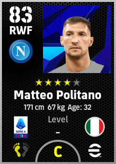 . Matteo Politano is a Right Wing Forward footballer from Italy who plays for Napoli A in eFootball 2026.