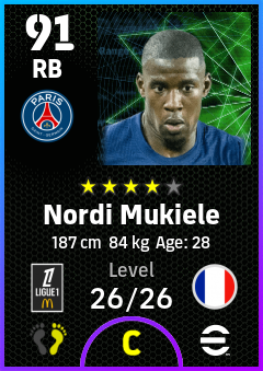.Nordi Mukiele is a Right Back footballer from France who plays for Paris Saint-Germain in eFootball 2026.