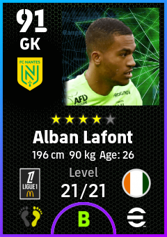 .Alban Lafont is a Goalkeeper footballer from Côte D'ivoire who plays for Fc Nantes in eFootball 2026.