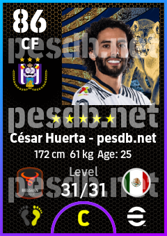 .César Huerta is a Center Forward footballer from Mexico who plays for Anderlecht Pw in eFootball 2026.