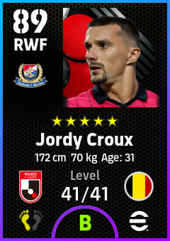 .Jordy Croux is a Right Wing Forward footballer from Belgium who plays for Yokohama F. Marinos in eFootball 2026.