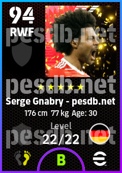 . Serge Gnabry is a Right Wing Forward footballer from Germany who plays for Free in eFootball 2026.