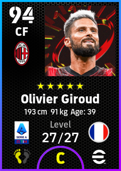 . Olivier Giroud is a Center Forward footballer from France who plays for Ac Milan in eFootball 2026.