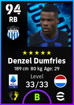 .Denzel Dumfries is a Right Back footballer from Netherlands who plays for Internazionale Milano in eFootball 2026.