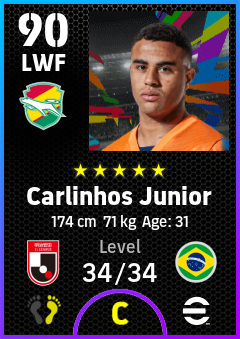 .Carlinhos Junior is a Left Wing Forward footballer from Brazil who plays for Jef United Chiba in eFootball 2026.