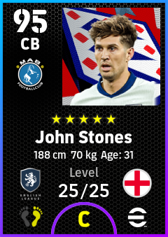 . John Stones is a Center Back footballer from England who plays for Manchester B in eFootball 2026.