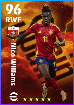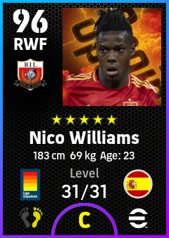 . Nico Williams is a Right Wing Forward footballer from Spain who plays for Bilbao Br in eFootball 2026.