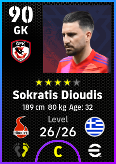 .Sokratis Dioudis is a Goalkeeper footballer from Greece who plays for Gaziantep Fk in eFootball 2026.
