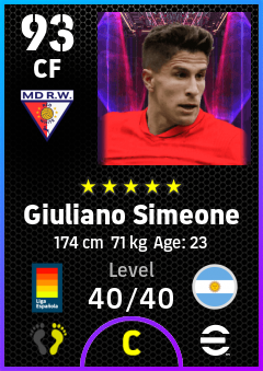 .Giuliano Simeone is a Center Forward footballer from Argentina who plays for Madrid Rosas Rb in eFootball 2026.