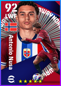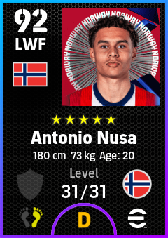 . Antonio Nusa is a Left Wing Forward footballer from Norway who plays for Norway in eFootball 2026.