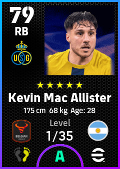 . Kevin Mac Allister is a Right Back footballer from Argentina who plays for Saint-Gilles Bg in eFootball 2026.