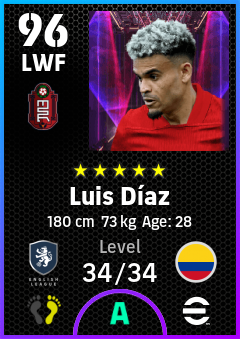 .Luis Díaz is a Left Wing Forward footballer from Colombia who plays for Liverpool R in eFootball 2026.