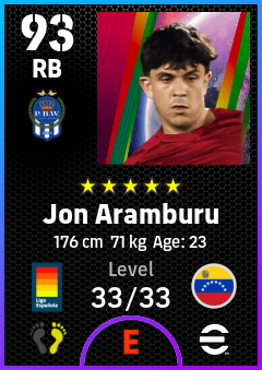 .Jon Aramburu is a Right Back footballer from Venezuela who plays for Vasco Gipuzkoa Ab in eFootball 2026.