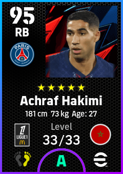 .Achraf Hakimi is a Right Back footballer from Morocco who plays for Paris Saint-Germain in eFootball 2026.