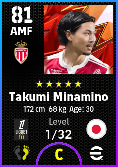 . Takumi Minamino is a Attacking Midfielder footballer from Japan who plays for As Monaco in eFootball 2026.
