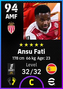 . Ansu Fati is a Attacking Midfielder footballer from Spain who plays for As Monaco in eFootball 2026.