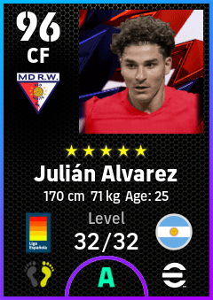 .Julián Alvarez is a Center Forward footballer from Argentina who plays for Madrid Rosas Rb in eFootball 2026.