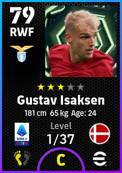 . Gustav Isaksen is a Right Wing Forward footballer from Denmark who plays for S.s. Lazio in eFootball 2026.