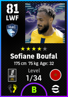 . Sofiane Boufal is a Left Wing Forward footballer from Morocco who plays for Havre Ac in eFootball 2026.