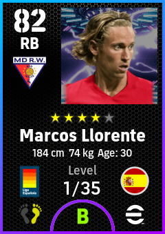 . Marcos Llorente is a Right Back footballer from Spain who plays for Madrid Rosas Rb in eFootball 2026.