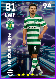 . Pedro Gonçalves is a Left Wing Forward footballer from Portugal who plays for Sporting Cp in eFootball 2026.