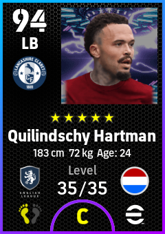 . Quilindschy Hartman is a Left Back footballer from Netherlands who plays for Burnley Rb in eFootball 2026.