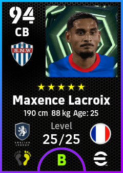 . Maxence Lacroix is a Center Back footballer from France who plays for Crystal Palace Rb in eFootball 2026.