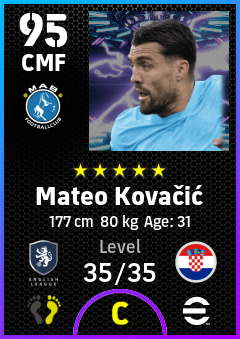 . Mateo Kovačić is a Center Midfielder footballer from Croatia who plays for Manchester B in eFootball 2026.