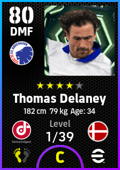. Thomas Delaney is a Defensive Midfielder footballer from Denmark who plays for København Hb in eFootball 2026.