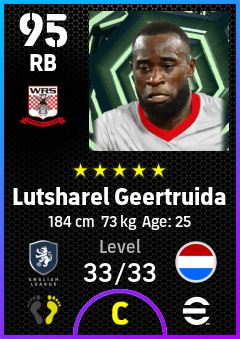 .Lutsharel Geertruida is a Right Back footballer from Netherlands who plays for Sunderland Rwb in eFootball 2026.