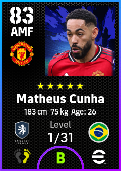 . Matheus Cunha is a Attacking Midfielder footballer from Brazil who plays for Manchester United in eFootball 2026.
