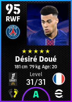 .Désiré Doué is a Right Wing Forward footballer from France who plays for Paris Saint-Germain in eFootball 2026.