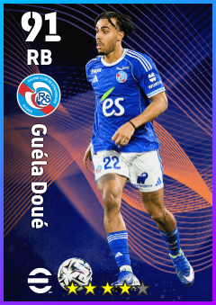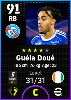 .Guéla Doué is a Right Back footballer from Côte D'ivoire who plays for Rc Strasbourg Alsace in eFootball 2026.