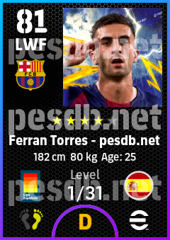 . Ferran Torres is a Left Wing Forward footballer from Spain who plays for Fc Barcelona in eFootball 2026.