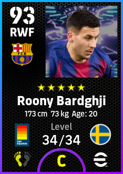 . Roony Bardghji is a Right Wing Forward footballer from Sweden who plays for Fc Barcelona in eFootball 2026.