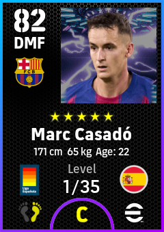 . Marc Casadó is a Defensive Midfielder footballer from Spain who plays for Fc Barcelona in eFootball 2026.