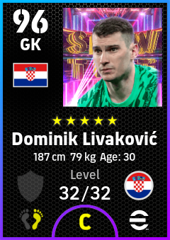 . Dominik Livaković is a Goalkeeper footballer from Croatia who plays for Croatia in eFootball 2026.
