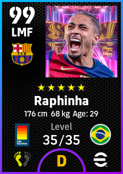 .Raphinha is a Left Midfielder footballer from Brazil who plays for Fc Barcelona in eFootball 2026.