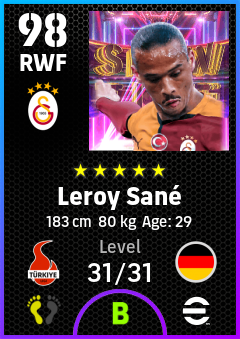 .Leroy Sané is a Right Wing Forward footballer from Germany who plays for Galatasaray Sk in eFootball 2026.