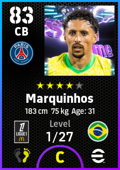. Marquinhos is a Center Back footballer from Brazil who plays for Paris Saint-Germain in eFootball 2026.