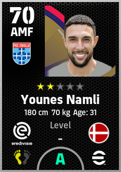 . Younes Namli is a Attacking Midfielder footballer from Denmark who plays for Pec Zwolle in eFootball 2026.