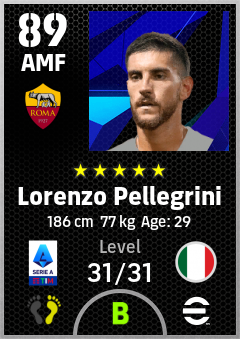 . Lorenzo Pellegrini is a Attacking Midfielder footballer from Italy who plays for Roma Gr in eFootball 2026.