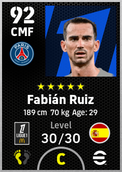 .Fabián Ruiz is a Center Midfielder footballer from Spain who plays for Paris Saint-Germain in eFootball 2026.