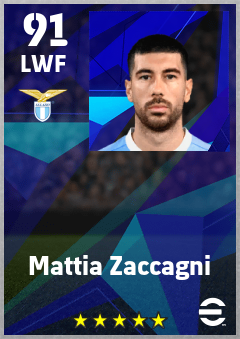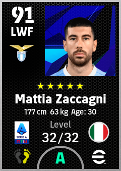 . Mattia Zaccagni is a Left Wing Forward footballer from Italy who plays for S.s. Lazio in eFootball 2026.