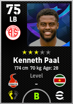 . Kenneth Paal is a Left Back footballer from Suriname who plays for Antalyaspor in eFootball 2026.