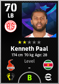 . Kenneth Paal is a Left Back footballer from Suriname who plays for Antalyaspor in eFootball 2026.