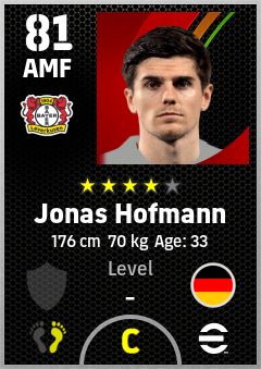 . Jonas Hofmann is a Attacking Midfielder footballer from Germany who plays for Bayer 04 Leverkusen in eFootball 2026.