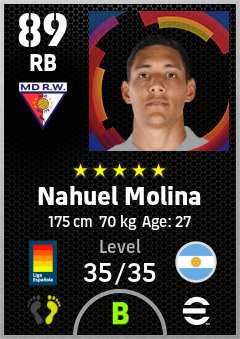 .Nahuel Molina is a Right Back footballer from Argentina who plays for Madrid Rosas Rb in eFootball 2026.