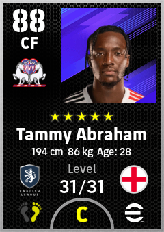 . Tammy Abraham is a Center Forward footballer from England who plays for Aston Rb in eFootball 2026.